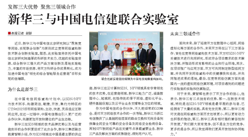 發(fā)揮三大優(yōu)勢 聚焦三領(lǐng)域合作 新華三與中國電信建聯(lián)合實(shí)驗(yàn)室(《通信產(chǎn)業(yè)報(bào)》)